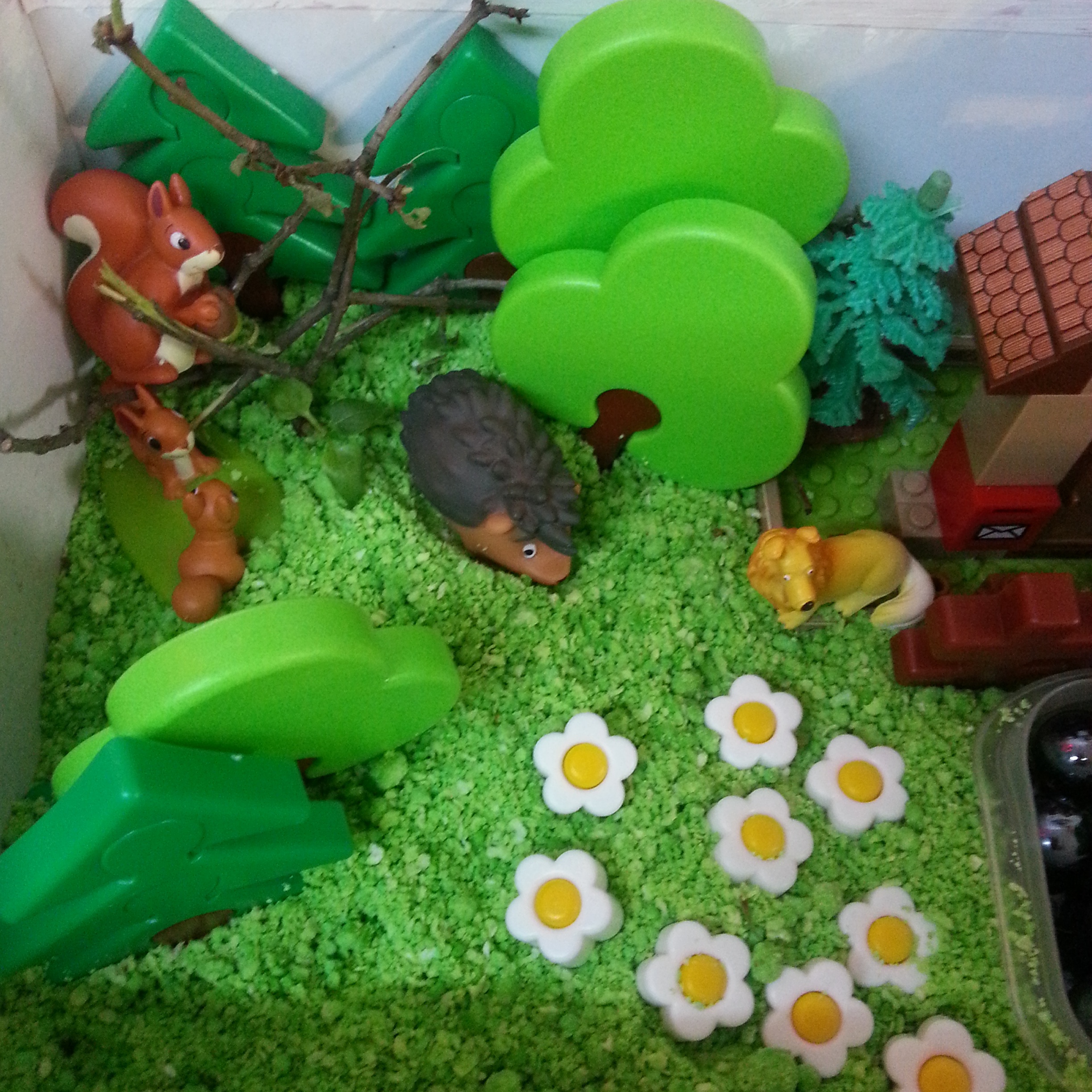 - Обязательно нужно по окончанию зимы гулять с ребенком на улице, и самое главное, так это замечать, как много всего интересного находится у нас под ногами (камушки, травинки, жучки и паучки), у нас над головой (распускающиеся листики на растениях, первоцветы, в лесу, в парках и клумбах) и обращать внимание малыша на то, что зимой мы этого всего не видим. Можно взять пару камешков, немного веточек, травы и соорудить дома сенсорную коробку на весеннюю тему. Что из себя представляют сенсорная коробка— это небольшая инсталляция того, что вы хотите рассказать и показать ребенку. К примеру весенняя тема, может быть отображена с помощью окрашенной в зеленый цвет крупы, насыпанной по периметру коробки (любая из под обуви), можно разложить камушки, и расставить тех животных которые выходят зимой из спячки (медведь, ежик), ребенок во время такого занятия трогает разные поверхности (крупа, колючий ежик и т.д.), развивает фантазию, играет по ролям и получает уйму удовольствия. А к тому же такая коробка, совершенно ничего не стоит, только вашего времени для ее подготовки.
