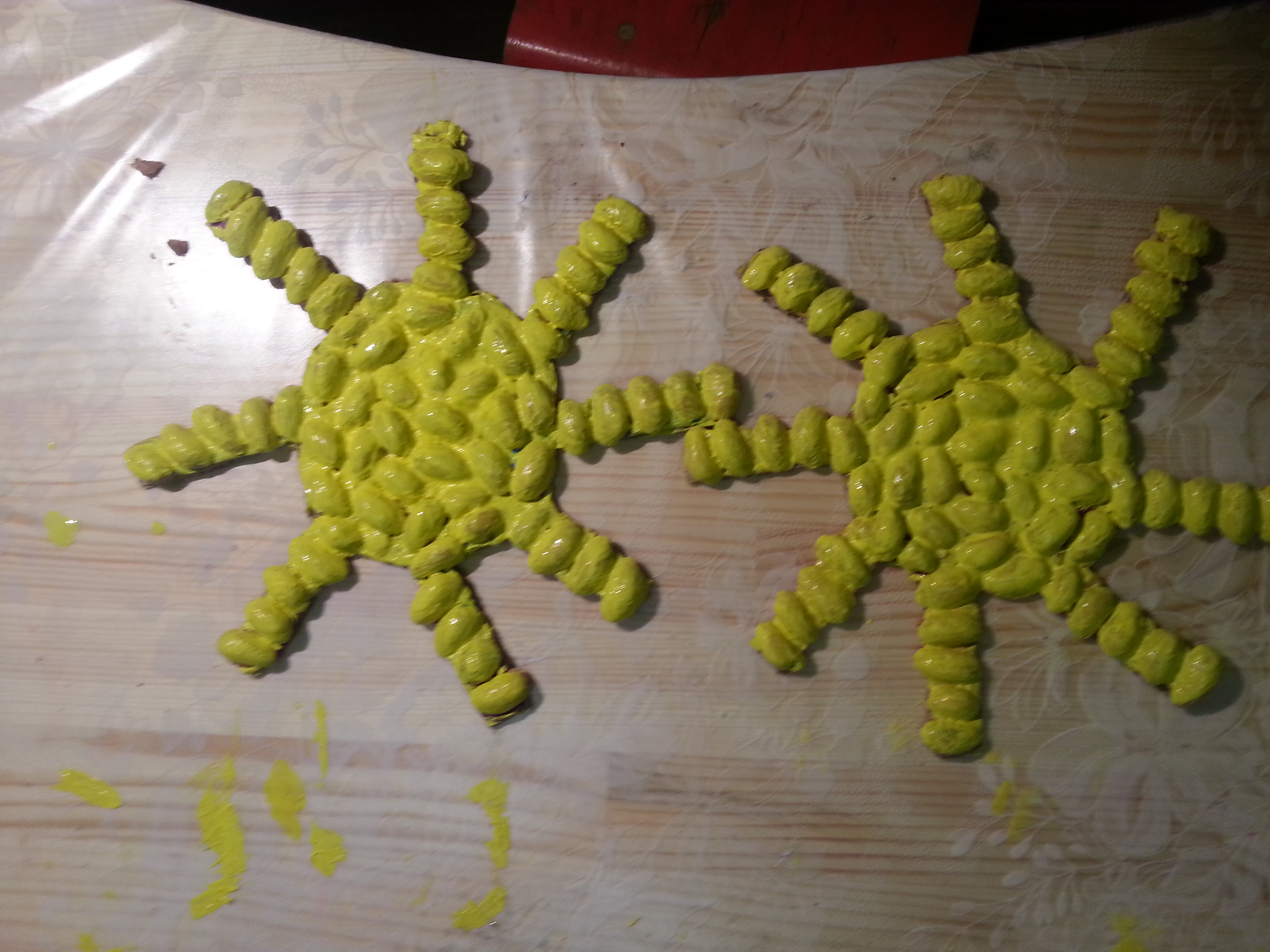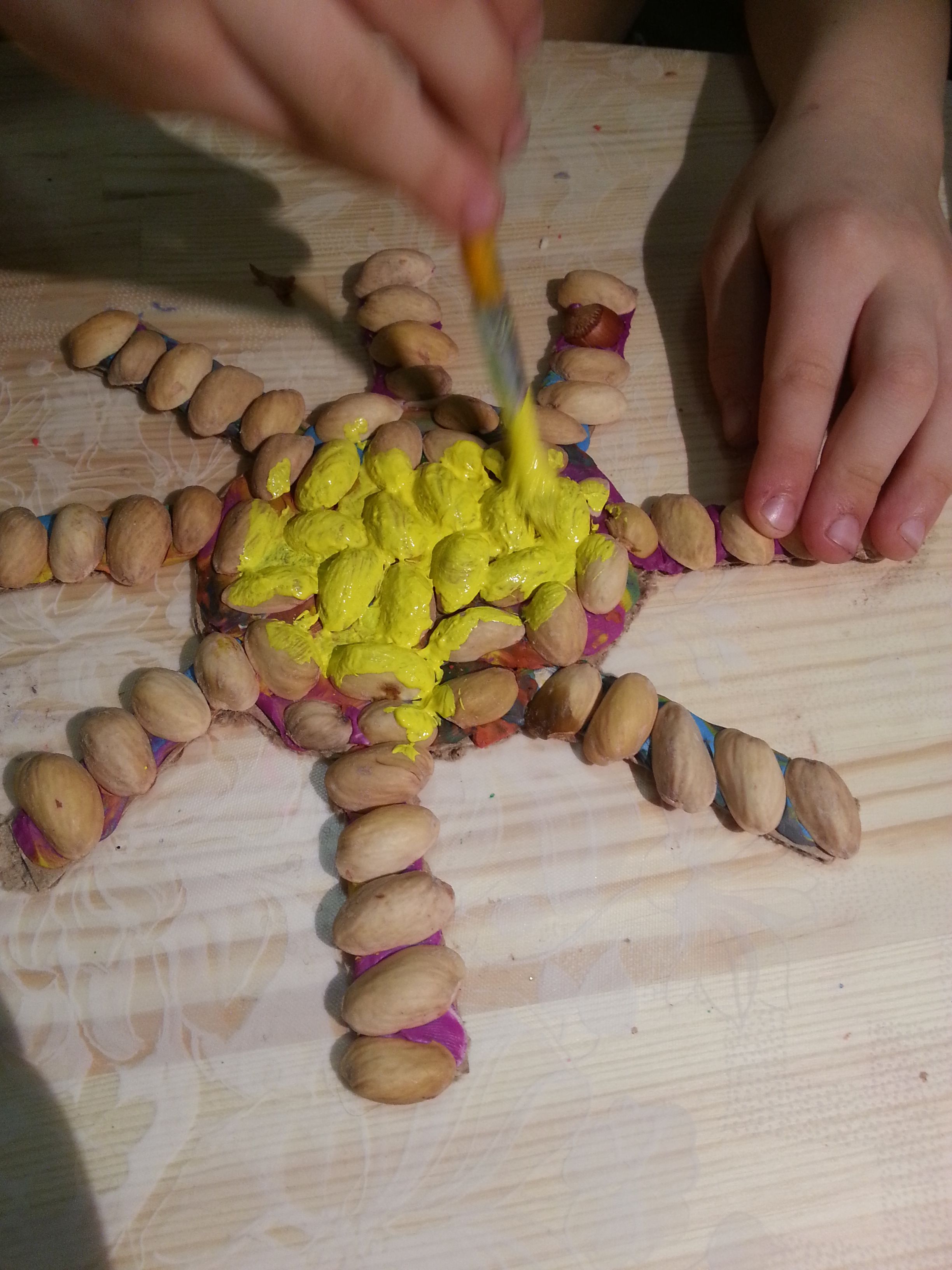 - Без чего не обходиться ни одна весна? Конечно же без яркого и обязательно теплого солнца! Дети отлично понимают, что такое солнце и что оно от них так далеко, что почти не достать, но можно попробовать и сделать с малышами свое солнышко. Мы предлагаем такой вариант в котором будет задействована мелкая моторика, изучение цвета, счет, креативное восприятие, совместное творчество и море положительных эмоций от процесса и результата. Нам понадобится за ранее вырезанное из плотного картона солнце, пластилин, скорлупки от фисташек, кисточки, желтая краска. На поверхность картона наносим толстым слоем пластилин, затем выкладываем поверх скорлупу и все это разукрашиваем, ждем пока высохнет и любуемся. Можно проделать отверстие и подвесить в комнате или на улице, что бы было еще чуточку теплее.