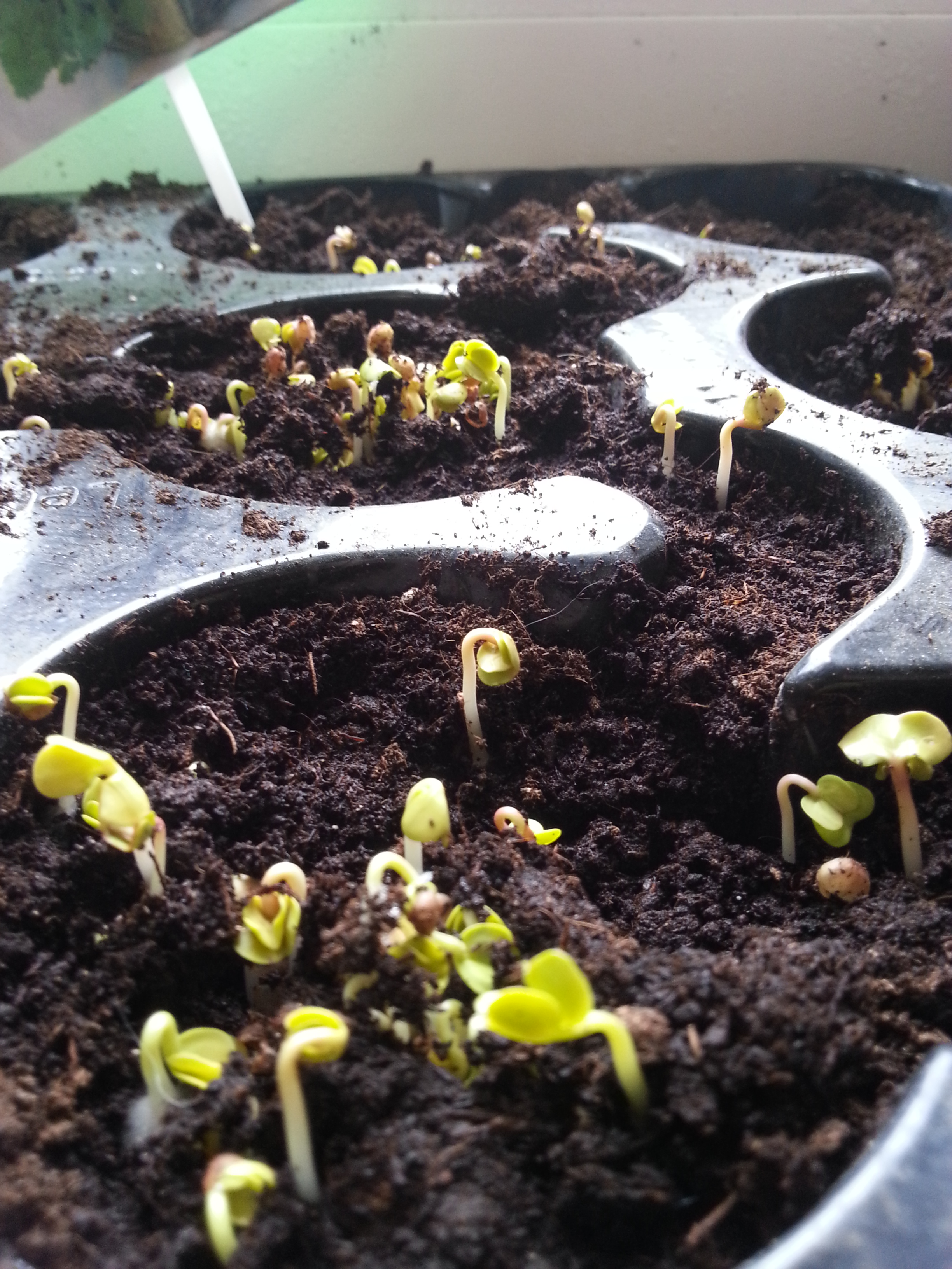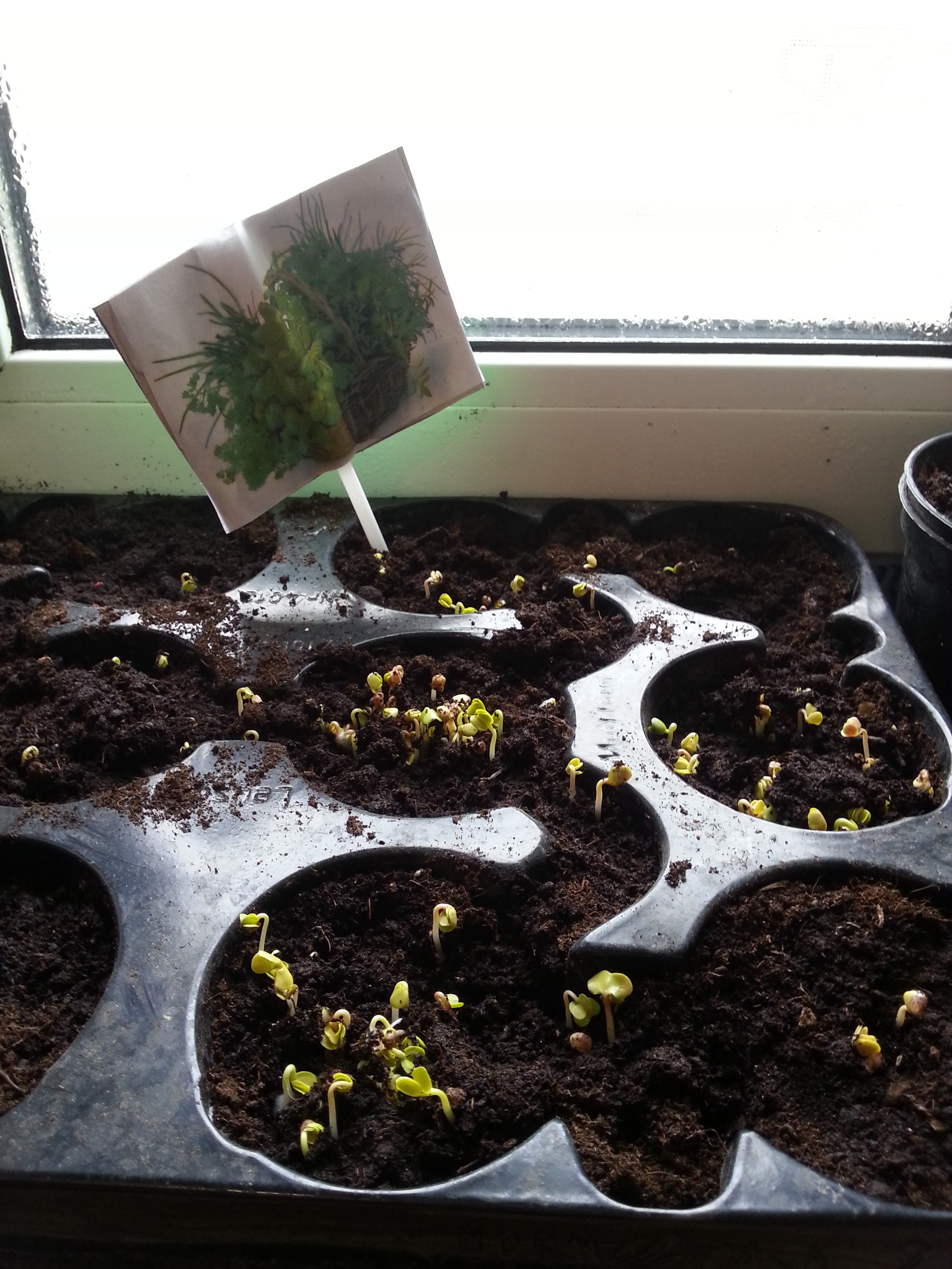 - Очень полезным является посадка зеленого огородика на подоконнике, это развивает мелкую моторику (закладывание семян в отверстия в земле) и развитие тактильных ощущений (перебирание в руках земли) и огромный познавательный процесс. Замечено, что очень быстро прорастает кресс-салат, буквально на следующий день уже можно видеть ростки, следующие по скорости укроп и петрушка, затем помидорки. Ну и не стоит забывать о луке, ведь на самой шелухе можно нарисовать веселую рожицу и потом делать луковички различные прически, что однозначно повеселит ваших ребятишек.